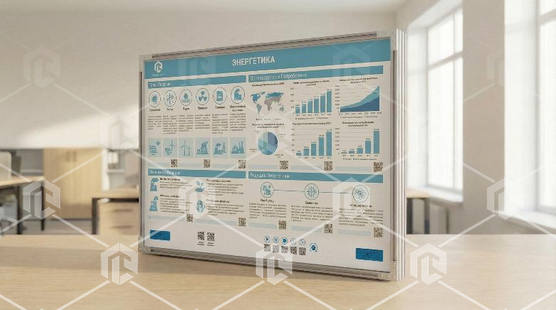 Интерактивный стенд-планшет предназначен для изучения технологий энергетики. Стенд представляет собой полноцветную панель, закрепленную на раме. На панели размещены метки QR для интерактивного взаимодействия с элементами. В конструкцию учебного оборудования интегрированы органы управления стендом. Плакат и его тематика могут быть разработаны под нужды заказчика.