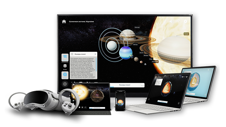 Наглядное 3D пособие ориентировано на школьную программу и может легко запускаться на интерактивных сенсорных панелях. Учебные виртуальные сцены направлены на изучение основных школьных направлении, таких как физика, химия, биология, география, окружающий мир, технологии.