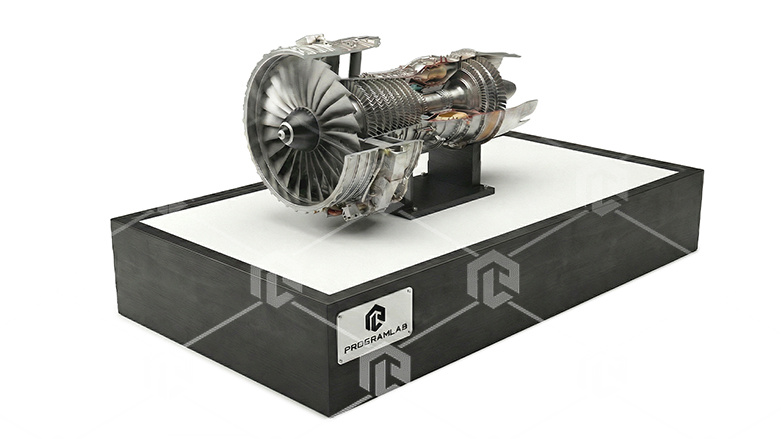 - модель двигателя действующая, с открывающимися капотами для визуализации движения ступеней компрессоров, приводится в движение скрытым электромотором;