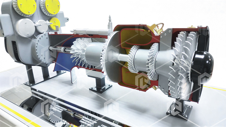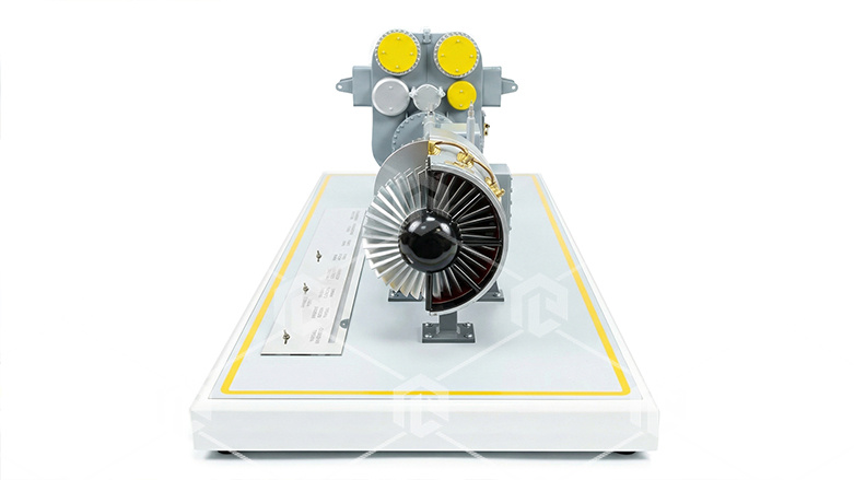 Макет позволяет изучить устройство, принцип действия и кинематику газотурбинного двигателя.