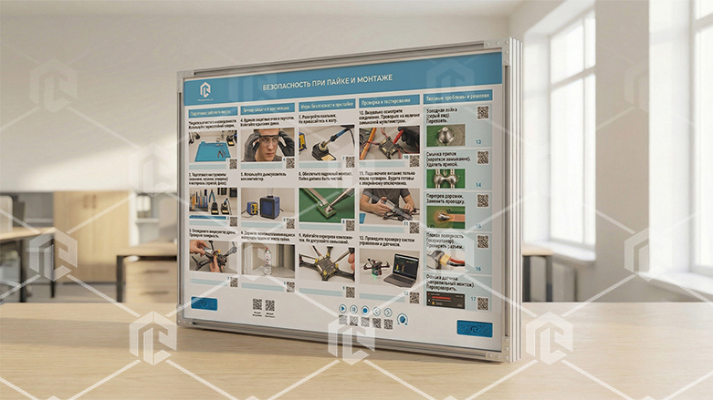 Интерактивный стенд-планшет позволяет изучить порядок действий для безопасной работы с паяльным оборудованием и электроникой при монтаже БПЛА. Стенд представляет собой полноцветную панель, закрепленную на раме. На панели размещены метки QR для интерактивного взаимодействия с элементами. В конструкцию учебного оборудования интегрированы органы управления стендом. Состав: