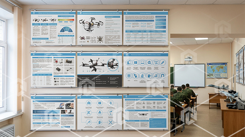 Тематика плакатов охватывает полный цикл работы с БПЛА — от теоретических основ и классификации до практических аспектов сборки, пилотирования и техники безопасности.