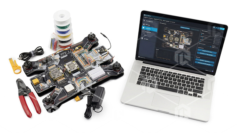 В комплект входят инструменты и запчасти для сборки и эксплуатации комплекса в виде виртуальных и практических полетов в помещении. Программная часть комплекса включает модули для изучения конструкции, сборки и пилотирования дронов, а также симулятор для отработки полетов. ПО устанавливается на АРМ оператора и поддерживает подключение пульта управления и FPV-гарнитуры.