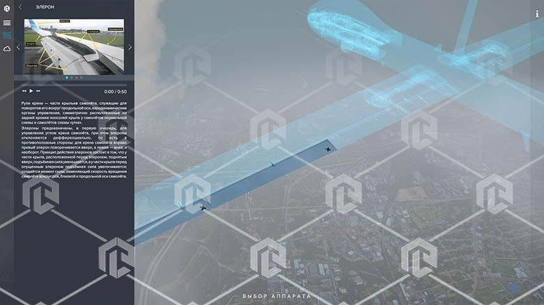 Виртуальный комплекс предназначен для проведения групповых практических занятий и самостоятельной работы учащихся. Обеспечивает изучение внутреннего и внешнего строения БПЛА в рамках специальностей «Конструкция Воздушного Судна» или аналогичных. Программное обеспечение содержит трехмерные разрезы основных элементов БПЛА, а также пояснения и графическую сводку о назначении отдельных узлов или органов управления.