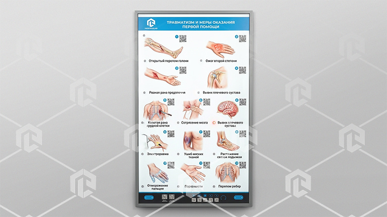 Электрифицированный стенд-тренажер предназначен для приобретения и закрепления базовых знаний и навыков оказания первой помощи при различных видах повреждений и травм организма человека. Электрифицированный стенд-тренажер представляет собой информационную панель с раздельной секционной световой индикацией. На стенде-тренажере размещены секции с изображениями травм различной степени тяжести. В конструкцию учебного оборудования интегрированы высокочувствительные сенсоры для управления стендом при помощи интерактивного воздействия приемо-передающих устройств во время обучающего процесса и проведения тестовых заданий.