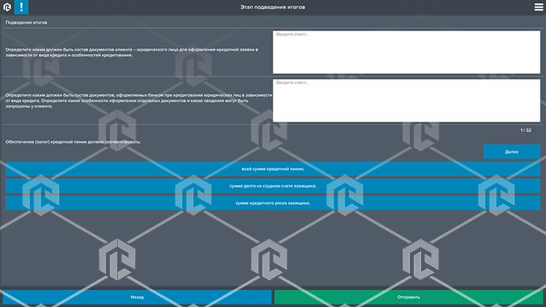 Цель деловой игры «Учебный банк» – создание имитационной модели финансово-кредитного учреждения для повышения эффективности учебной, проектной и исследовательской деятельности, сокращения разрыва между теоретическими знаниями и прикладными навыками студентов. Специализированный модульный программный комплекс, позволяет с помощью программных модулей и примеров шаблонов документов реализовать процесс в части обучения и контроля знаний обучающихся.