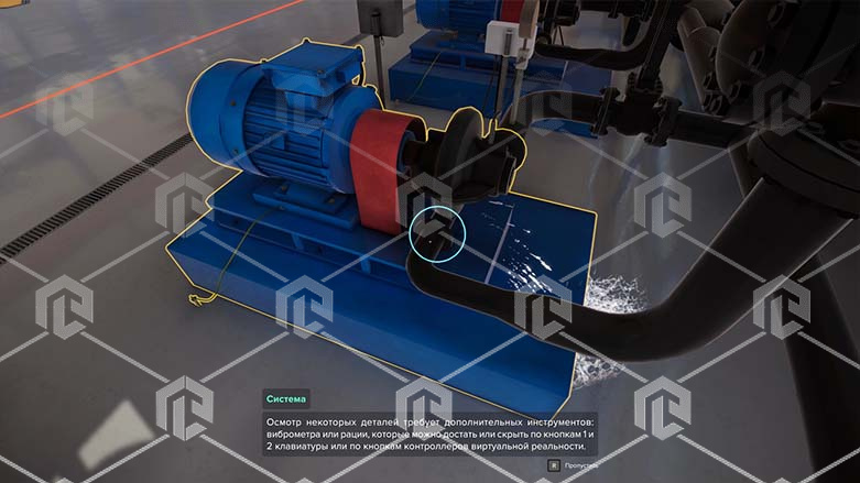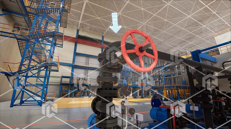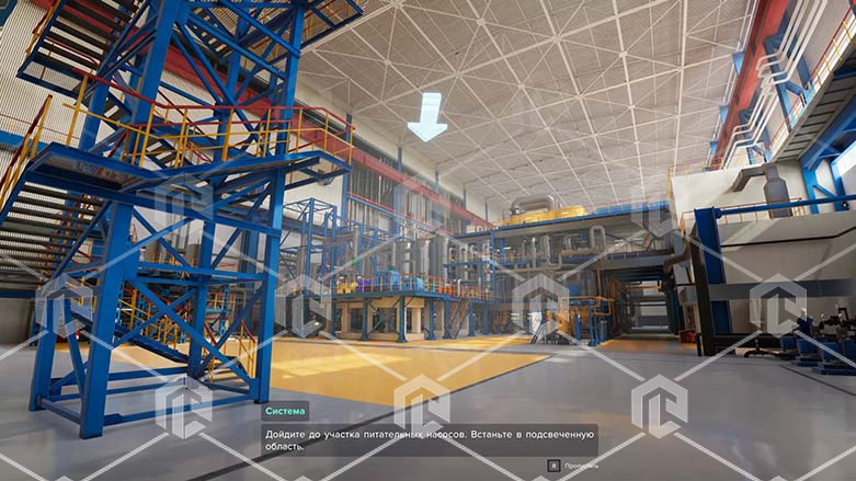 Программный комплекс "Тепловая энергетика" - Модуль программного комплекса тепловая энергетика, тренирующий последовательность действий обходчика паротурбинного оборудования ТЭЦ при помощи интерактивного взаимодействия с элементами цифрового двойника оборудования и пультами управления с помощью контроллеров системы виртуальной реальности.