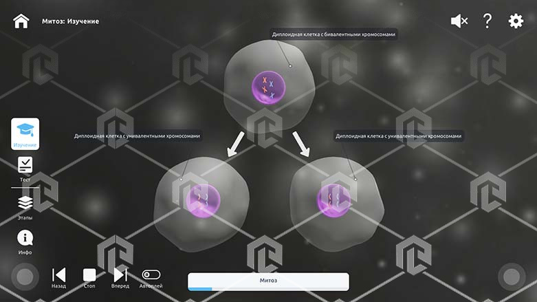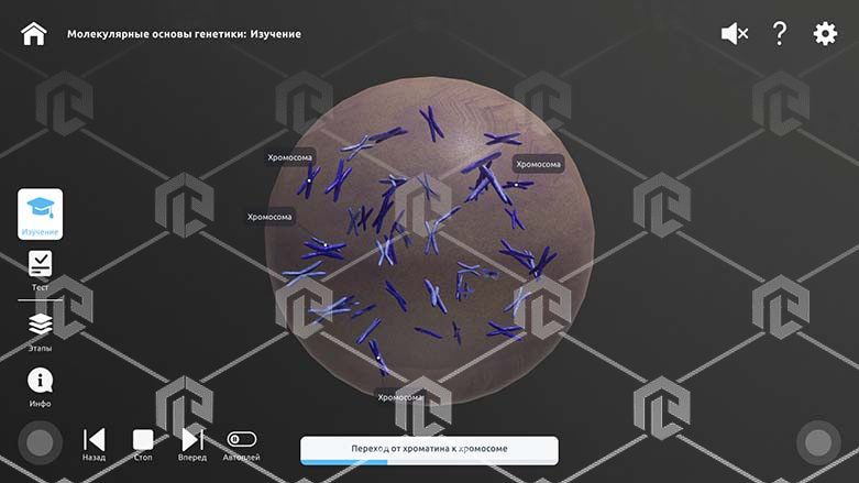 Интерактивное наглядное 3D пособие «Познание: Генетика и селекция», позволяет с помощью трехмерной графики и анимации изучить курс данной дисциплины и имеет в наборе следующие виртуальные сцены: