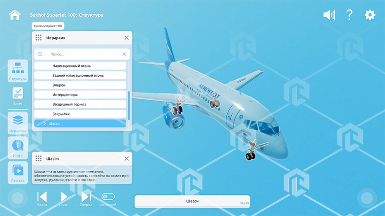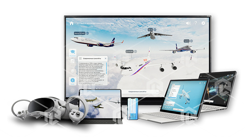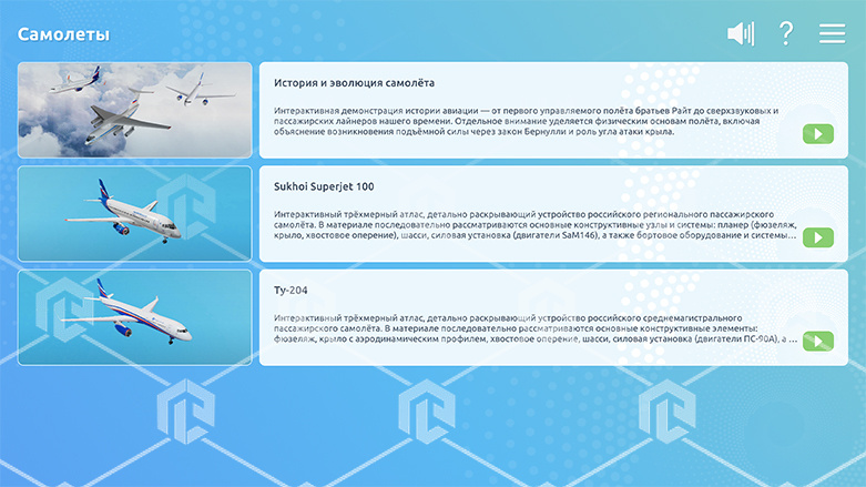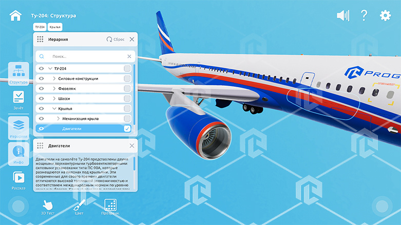 Интерактивное наглядное 3D пособие «Познание: Самолеты» позволяет с помощью трехмерной графики и анимации изучить курс данной дисциплины и имеет в наборе следующие виртуальные сцены: