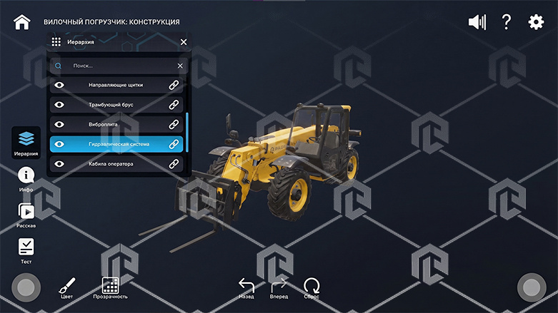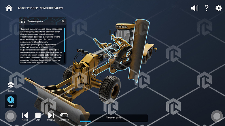 Модуль программного комплекса "Специальная и строительная техника", демонстрирующий принципиальные трехмерные модели в части строительных машин различных видов. Пользователь выполняет сценарии интерактивного изучения строения и основных узлов в режиме обучения по демонстрируемой принципиальной трехмерной модели строительных машин. ПО позволяет проводить интерактивные демонстрации принципа действия и проверку знаний методом тестирования по элементам моделей.