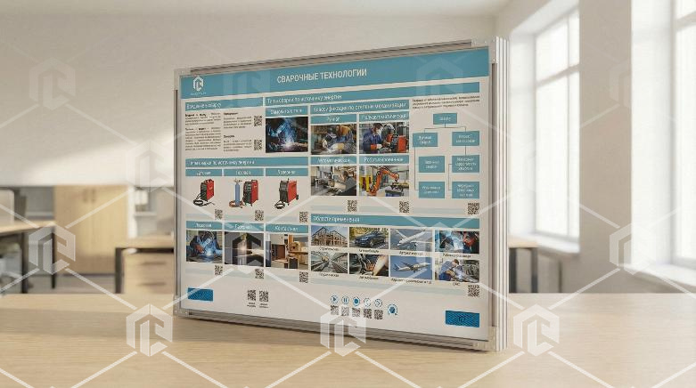 Интерактивный стенд-планшет предназначен для изучения сварочных технологий. Стенд представляет собой полноцветную панель, закрепленную на раме. На панели размещены метки QR для интерактивного взаимодействия с элементами. В конструкцию учебного оборудования интегрированы органы управления стендом. Плакат и его тематика могут быть разработаны под нужды заказчика.