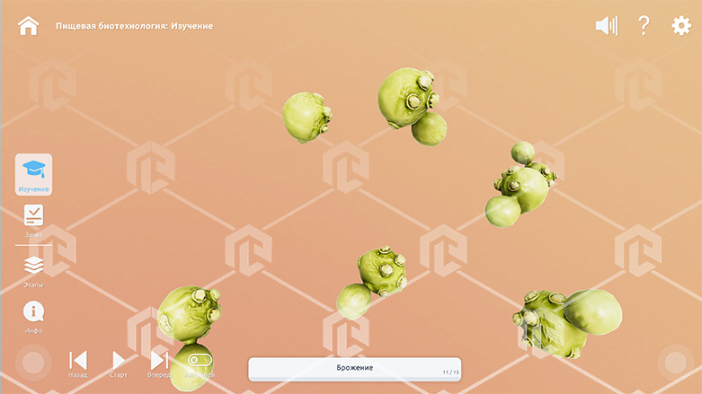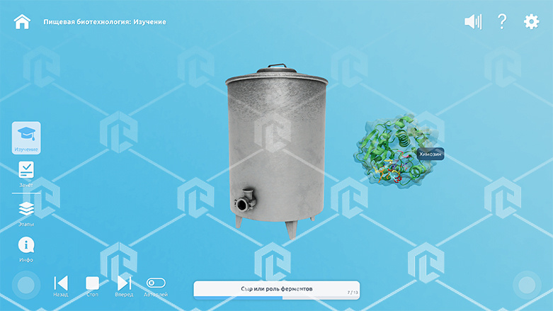 Интерактивное наглядное 3D пособие «Познание: Биотехнологии и пищевое производство», позволяет с помощью трехмерной графики и анимации изучить курс данной дисциплины и имеет в наборе следующие виртуальные сцены: