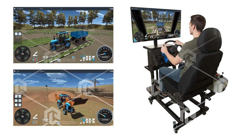Интерактивный учебный тренажер предназначен для подготовки водителей и операторов трактора, а также для совершенствования или коррекции имеющихся навыков управления у водителей и операторов с разным уровнем подготовки. Тренажер представляет собой аппаратно-программный комплекс. Учебный тренажер разработан в соответствии с программами подготовки специалистов, водителей и операторов, отвечает требованиям пожарной и электробезопасности, а также санитарных правил и нормативов.