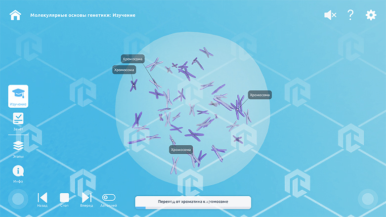 Интерактивное наглядное 3D пособие «Познание: Генетика и селекция», позволяет с помощью трехмерной графики и анимации изучить курс данной дисциплины и имеет в наборе следующие виртуальные сцены: