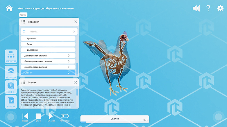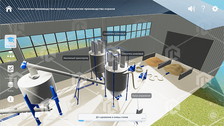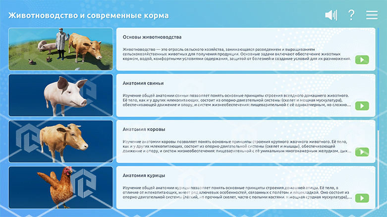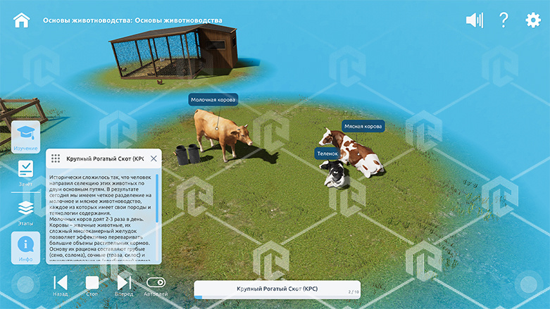 Интерактивное наглядное 3D пособие «Познание: Животноводство и современные корма», позволяет с помощью трехмерной графики и анимации изучить курс данной дисциплины и имеет в наборе следующие виртуальные сцены: