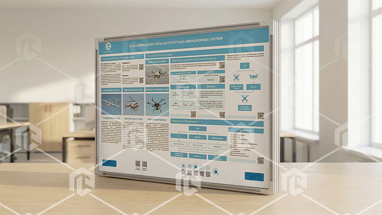 Интерактивный стенд-планшет позволяет изучить различные виды беспилотных авиационных систем, их основные отличительные признаки, способы классификации и сферы применения. Стенд представляет собой полноцветную панель, закрепленную на раме. На панели размещены метки QR для интерактивного взаимодействия с элементами. В конструкцию учебного оборудования интегрированы органы управления стендом. Состав: