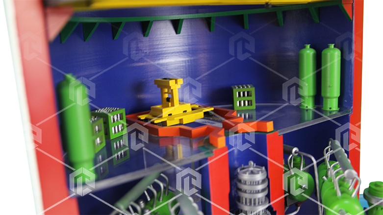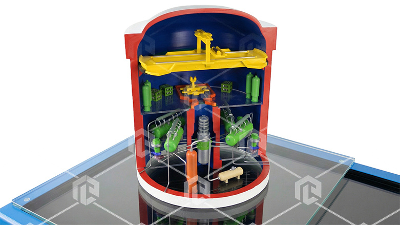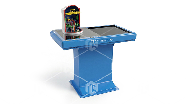 Мобильді платформадағы стационарлық интерактивті макет сенсорлық енгізу және басқару мүмкіндігімен атом электр станциясының реакторлық бөліміндегі технологиялық процестердің реттілігі мен логистикасын зерттеуге, таңдалған жабдық бөлігінің үш өлшемді бөліктерін көрсетуге мүмкіндік береді. макет дисплейінде.