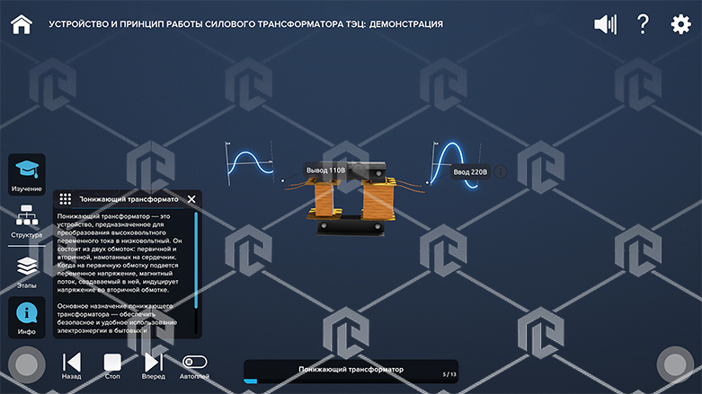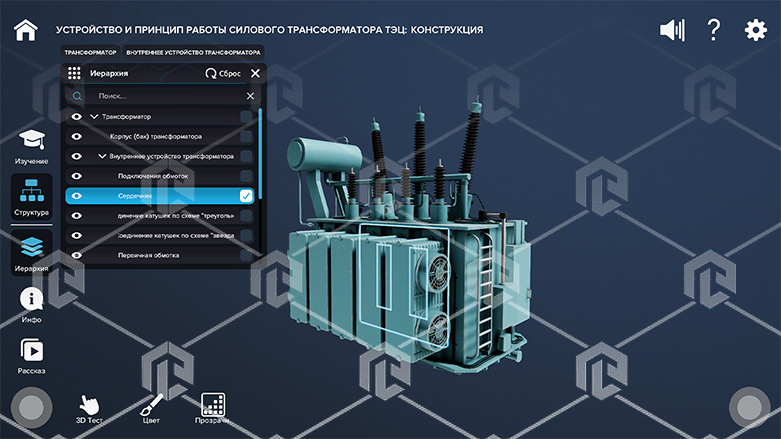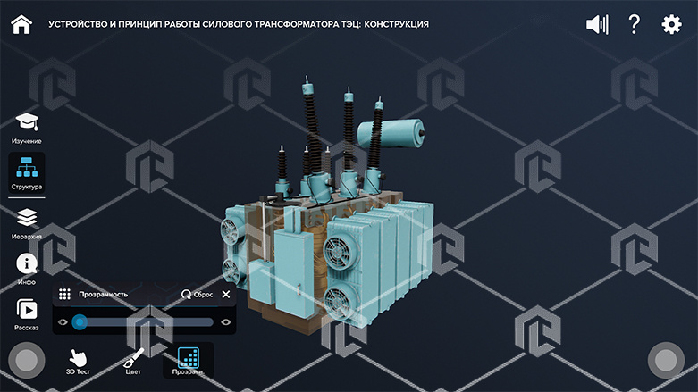 Виртуалды оқу-жаттығу кешені жылу электр станциясының күштік трансформаторының құрылымын және жұмыс істеу принципін зерттеуге арналған.