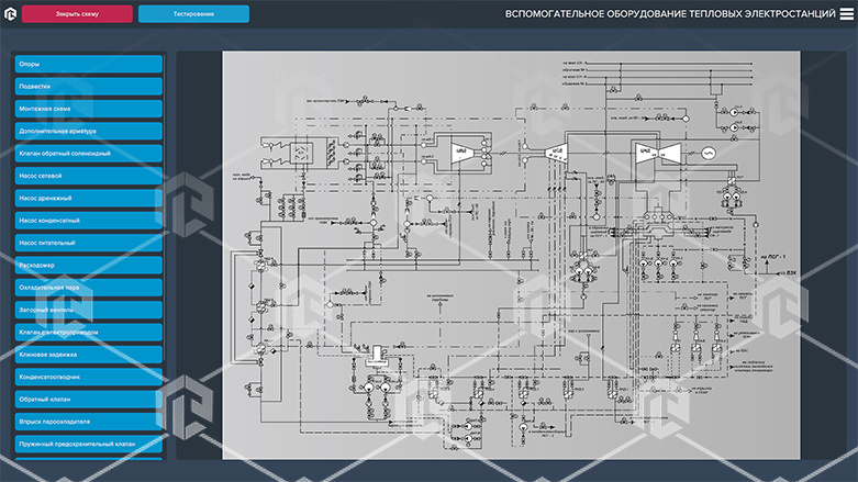 Программа содержит трехмерные модели вспомогательного оборудования, с возможностью изучения элементов и отображения трехмерных разрезов. В состав комплекса входит компонент справочных материалов и технической поддержки, а также система проверки и оценивания полученных знаний.