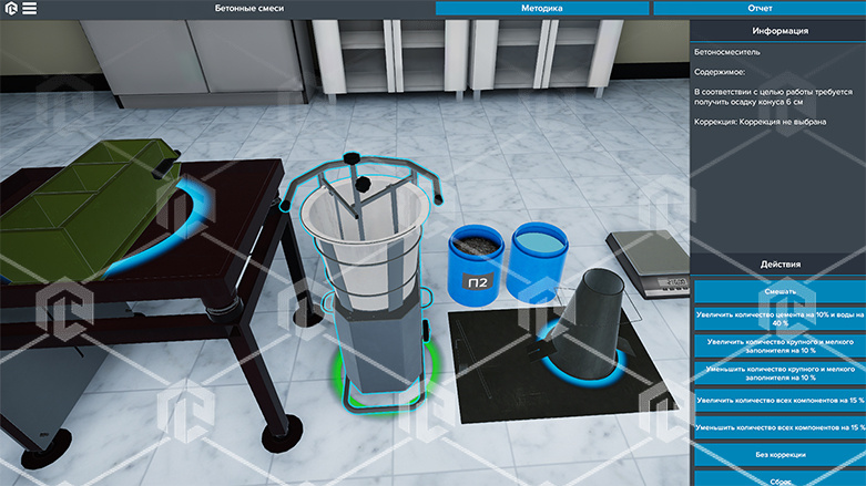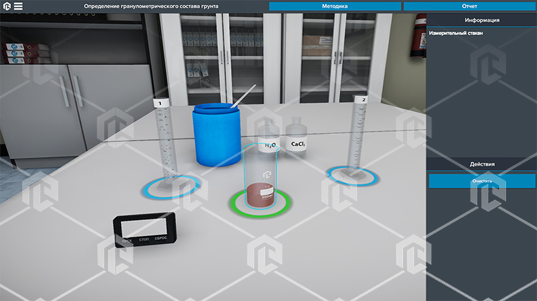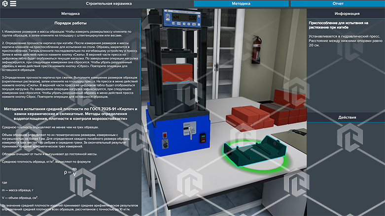 Үш өлшемді графика және интерактивті ортаның көмегімен нақты құрылыс материалдары зертханасының аспаптары мен жабдықтары имитацияланады.
