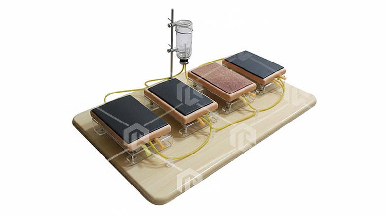 Тренажер - бұл тері және тері астындағы қабаттардың төрт симуляторы орнатылған толық түсті панель. Медициналық процедуралардың екі түрі бойынша дағдыларды жаттықтыруға арналған: ішілік инъекциялар және қан тамырларының қолжетімділігінің әртүрлі жағдайында қан сынамаларын алу.