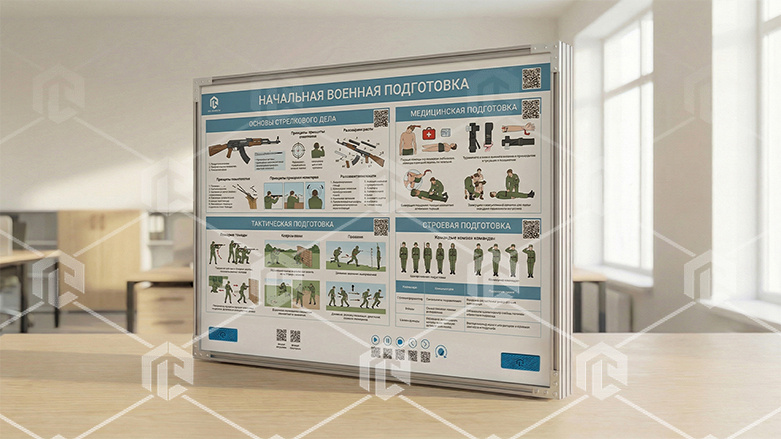 Интерактивный стенд-планшет предназначен для изучения начальной военной подготовки. Стенд представляет собой полноцветную панель, закрепленную на раме. На панели размещены метки QR для интерактивного взаимодействия с элементами. В конструкцию учебного оборудования интегрированы органы управления стендом. Плакат и его тематика могут быть разработаны под нужды заказчика.