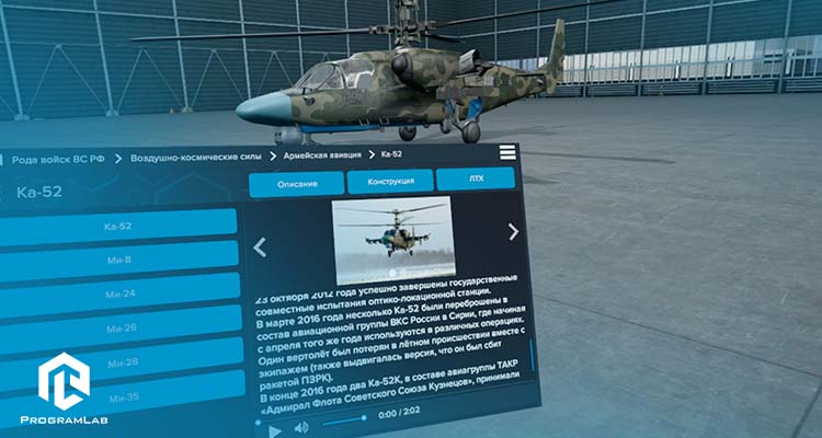 Полноценный справочно‑учебный инструмент для изучения современной военной техники, стоящей на вооружении РФ. Высокодетализированные 3D‑модели, анимация и структурированная справочная информация делают изучение наглядным и увлекательным. Интерактивные подсказки при наведении на элементы показывают названия и описания узлов. Материал распределён по разделам в соответствии с родами войск ВС РФ, что упрощает планирование и проведение тематических занятий.